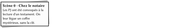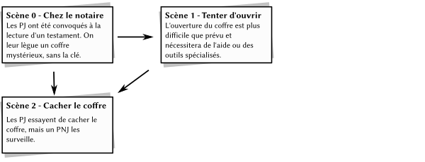Prenons pour exemple un mini-scénario. Les personnages ont hérité d'un coffre solidement fermé. Il y a des témoins, qui se demandent ce que le coffre peut bien contenir, et les rumeurs commencent à tourner dans le village.